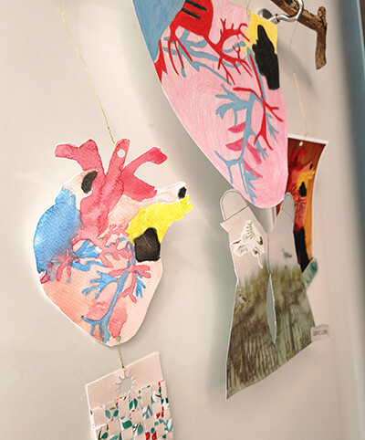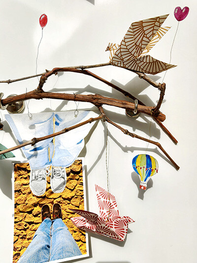 De petits objets complices dansent au milieu des travaux des élèves pour être mis en scène sous forme de mobiles, de posters ou encore de leporellos …