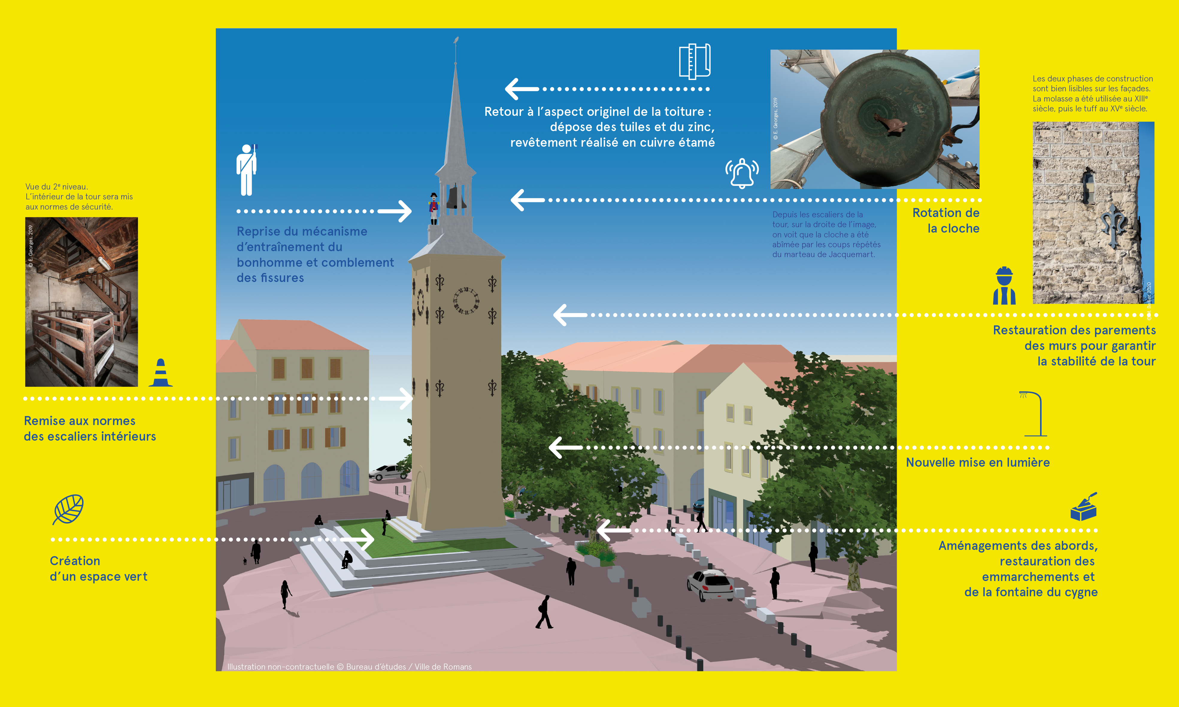 En 2019 le Jacquemart fêtait ses 590 ans ! Des travaux de restauration pour rendre sa jeunesse au Jacquemart ont été entrepris grâce à la contribution de l’Etat, de la Région, du Département, de ses mécènes et… des romanais ! En effet une grande campagne de financement participatif a été lancée pour aider à rénover le Jacquemart, symbole des romanais, qui depuis 2 ans ne frappait plus sa cloche pour des raisons de sécurité…